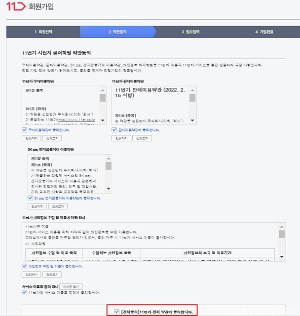11번가 전체 약관에 동의 클릭