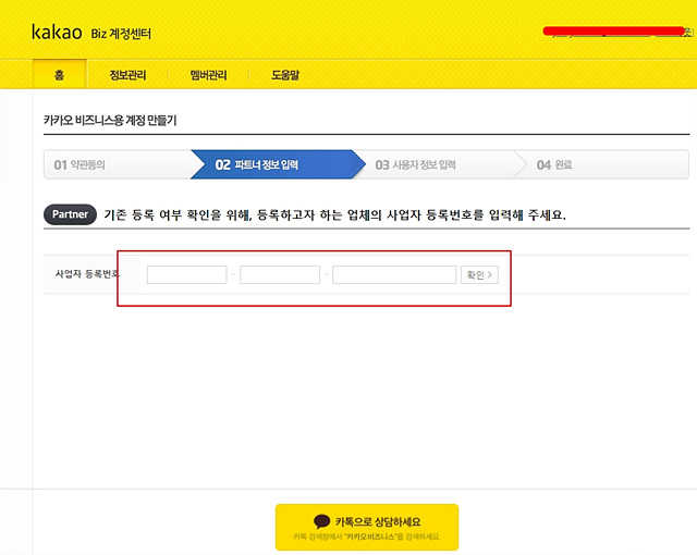 카카오비즈니스 계정 이용 약관 동의 클릭