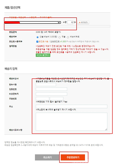 고객주문 상품 확인 후 상품 개수 체크→고객 인적사항 입력 후 주문 완료하기 클릭