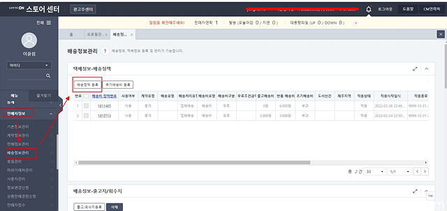 - 배송정보-출고지/회수지: 출고지/회수지 등록