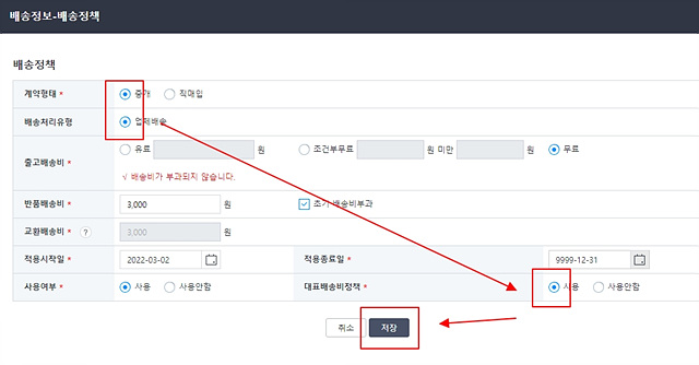 - 배송정보-배송정책: 계약형태→중계→대표배송비정책(사용) 체크