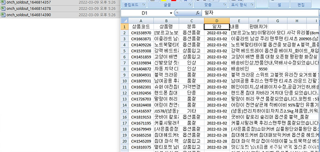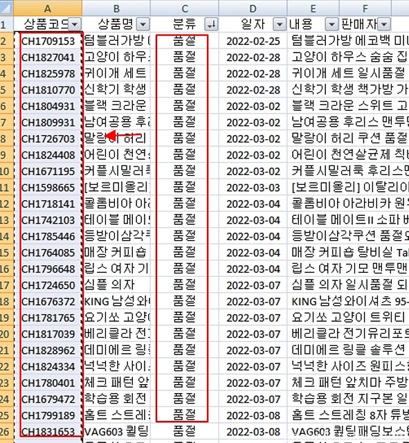 6. 엑셀의 필터를 이용 분류별로 정렬→상품코드 복사