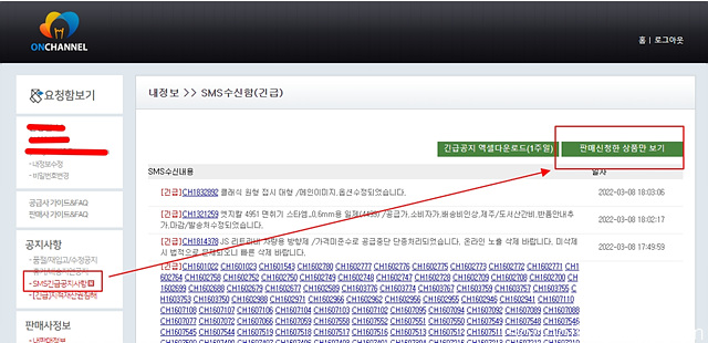2. 좌측 하단 공지사항→SMS긴급공지사항→판매 신청한 상품만 보기 클릭