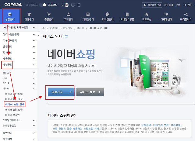 상점관리→채널 관리→네이버 쇼핑 안내→입점 신청