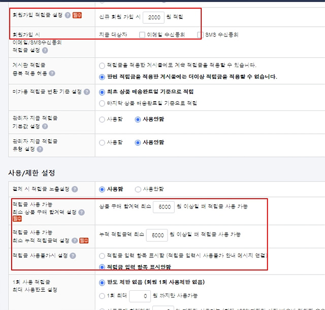 사용/제한 설정 : 적립금 사용가능한 최소 상품 구매 합계와 누적 적립금액을 설정 한다.