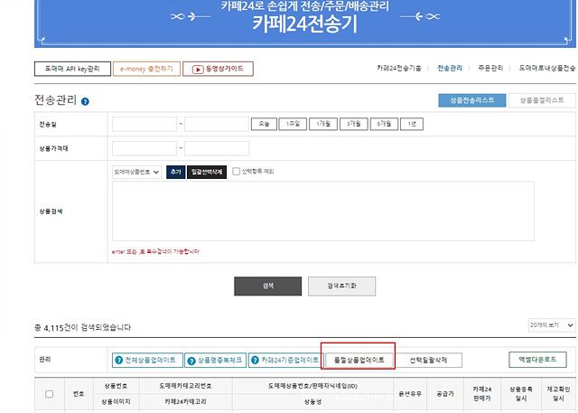 2. 도매매 사이트 우측 상단→카페 24 전송기→전송관리