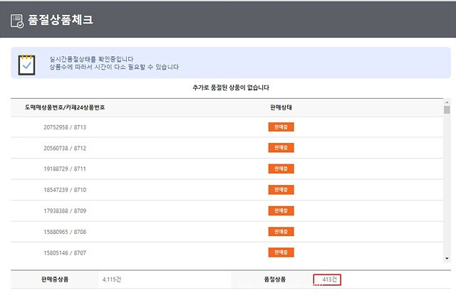 - 품절 상품을 확인 금일 날짜로 413건의 품절 상품이 있다.