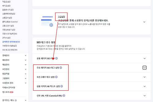 - 상품관리→상품등록→제일 하단→검색엔진 최적화SEO
