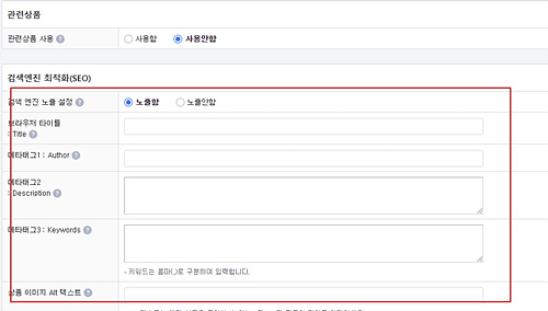 - 상품등록→제일 하단→검색엔진 최적화SEO